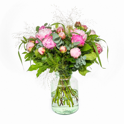 Pioenen boeket met vaas bezorgen